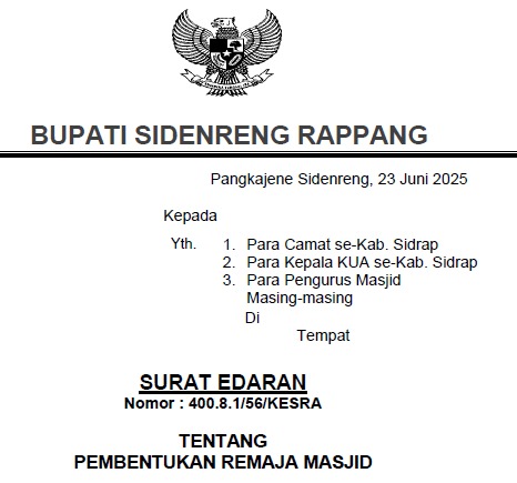 Sidenreng Rappang – Pemerintah Kabupaten Sidenreng Rappang, melalui Bupati Syaharuddin Alrif, resmi mengeluarkan Surat Edaran Nomor 400.8.1/56/KESRA tentang Pembentukan Remaja Masjid. Ditetapkan di Pangkajene Sidenreng pada 23 Juni 2025, surat ini ditujukan kepada seluruh Camat, Kepala KUA, dan pengurus masjid se-Kabupaten Sidrap untuk membentuk kepengurusan Remaja Masjid dengan empat fokus utama: menumbuhkan rasa cinta generasi muda terhadap masjid, membina karakter remaja agar berakhlak mulia dan bertakwa, menyediakan ruang aktualisasi kegiatan positif berbasis masjid, serta menjamin kesinambungan regenerasi kepemimpinan masjid di masa mendatang.