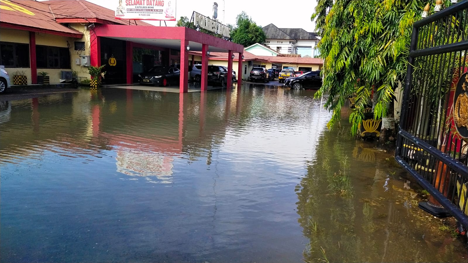 Tak terkecuali, Mapolres Bone ikut dilanda banjir dengan ketinggian air mencapai di atas mata kaki orang dewasa.
