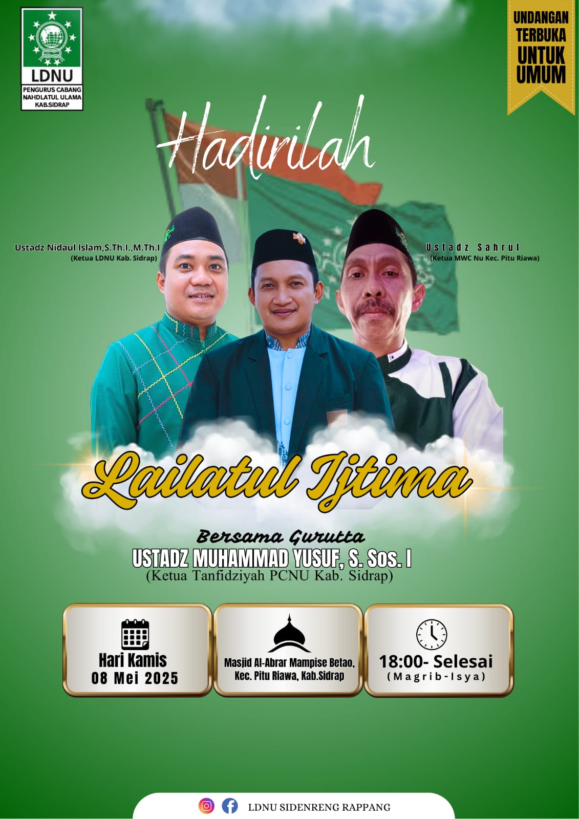 Lailatul Ijtima merupakan forum silaturahmi dan penguatan ideologi Ahlussunnah wal Jamaah An-Nahdliyah yang digelar secara bergiliran setiap bulan. Pada bulan sebelumnya (April), kegiatan ini dilaksanakan di Masjid BTN Nur Aisy, Kecamatan Maritengngae, sementara untuk bulan mendatang (Juni) telah direncanakan akan diselenggarakan di wilayah Kecamatan Baranti.