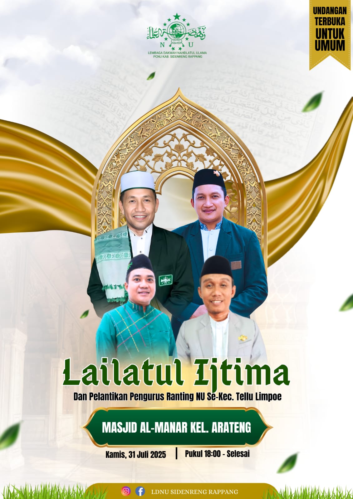 SIDENRENG RAPPANG — Lembaga Dakwah Nahdlatul Ulama (LDNU) Kabupaten Sidenreng Rappang menggelar Lailatul Ijtima’ sekaligus Pelantikan Ranting NU se-Kecamatan Tellu Limpoe periode 2025–2030, Kamis malam (31/7/2025), bertempat di Masjid Al Manar, Kelurahan Arateng.