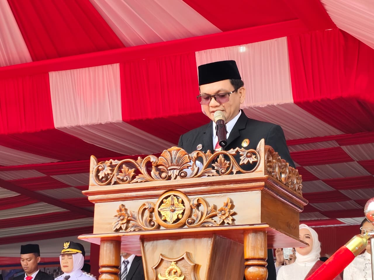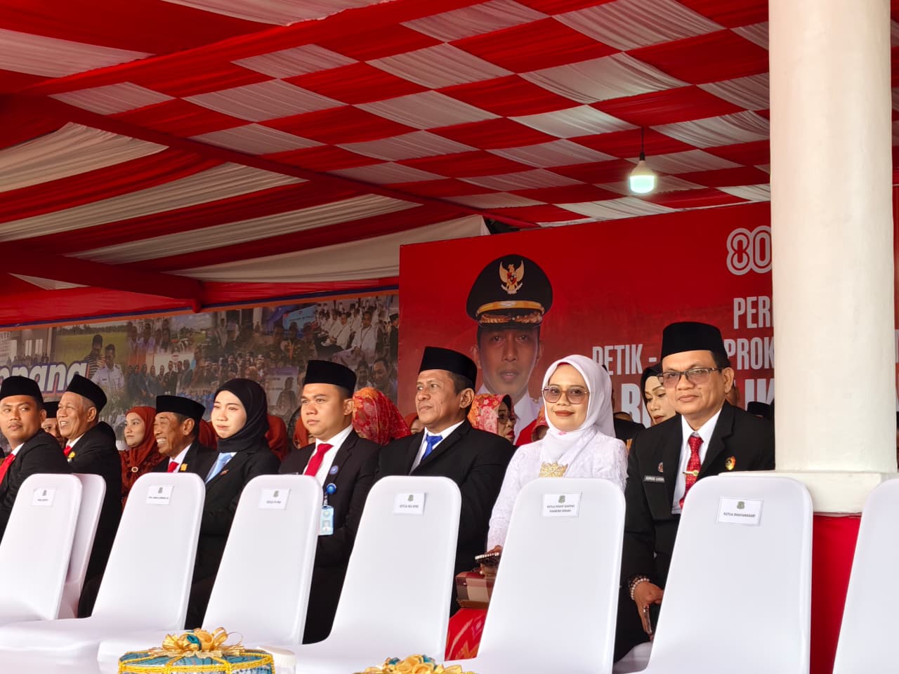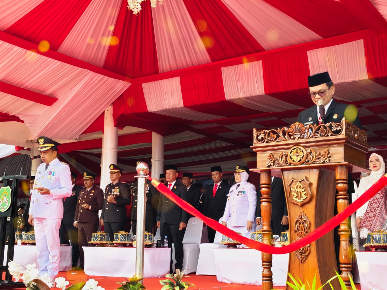 Bupati Sidrap, H. Syaharuddin Alrif, bertindak sebagai Inspektur Upacara, sementara Ketua Dewan Perwakilan Rakyat Daerah (DPRD) Sidrap, H. Takyuddin Masse tampil membacakan teks Proklamasi, di Lapangan Kompleks SKPD, Ahad (17/8/2025).