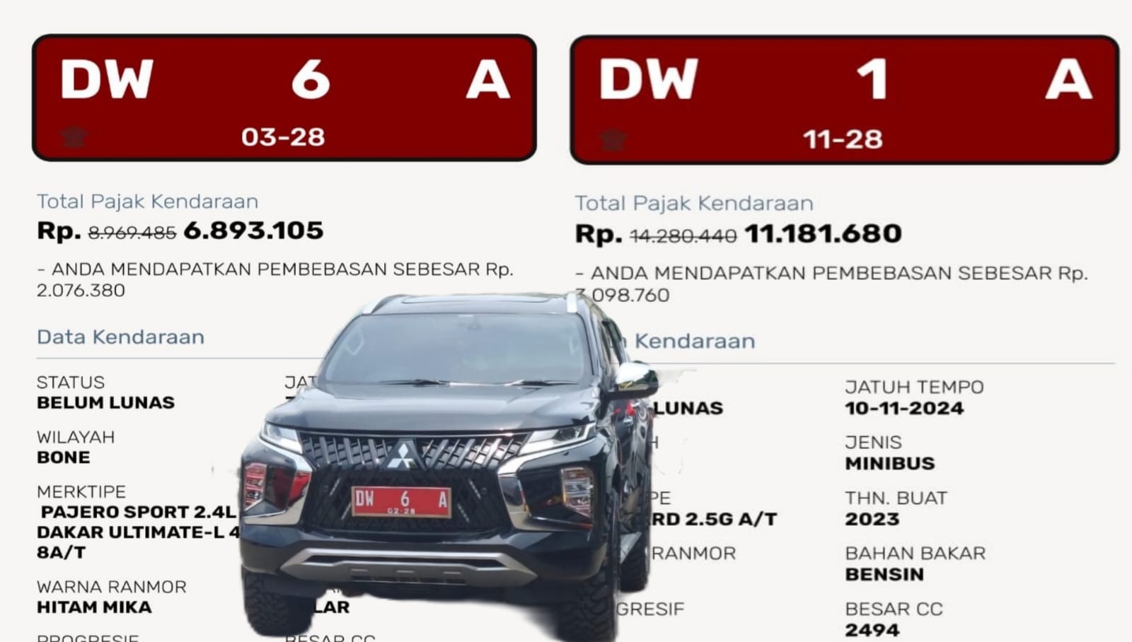 Mobil Mitsubishi Pajero Sport bernomor polisi DW 6 A yang digunakan Sekretaris Daerah (Sekda) Bone tercatat belum melunasi pajak sejak 30 Maret 2024. Nilai yang harus dibayar Rp6.893.105, setelah mendapat pembebasan Rp2.076.380 dari total sebelumnya Rp8.969.485.